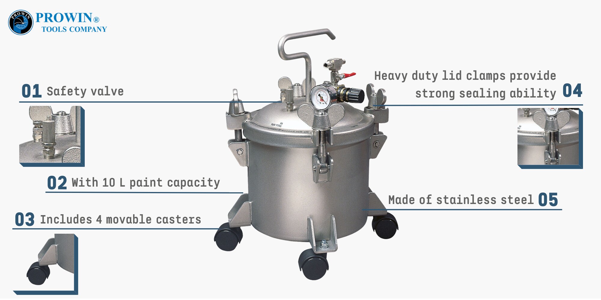 Prowin PTS-10E 10 升不锈钢油漆压力罐为您提供存储大量油漆的好处,可以快速应用,节省您的时间和金钱。这款喷漆罐采用优质不锈钢,具有以下优点高耐腐蚀性,易于清理。使用我们的重型盖夹和安全阀,您可以轻松操作并保持油漆质量。此外,您不必担心泄漏问题。