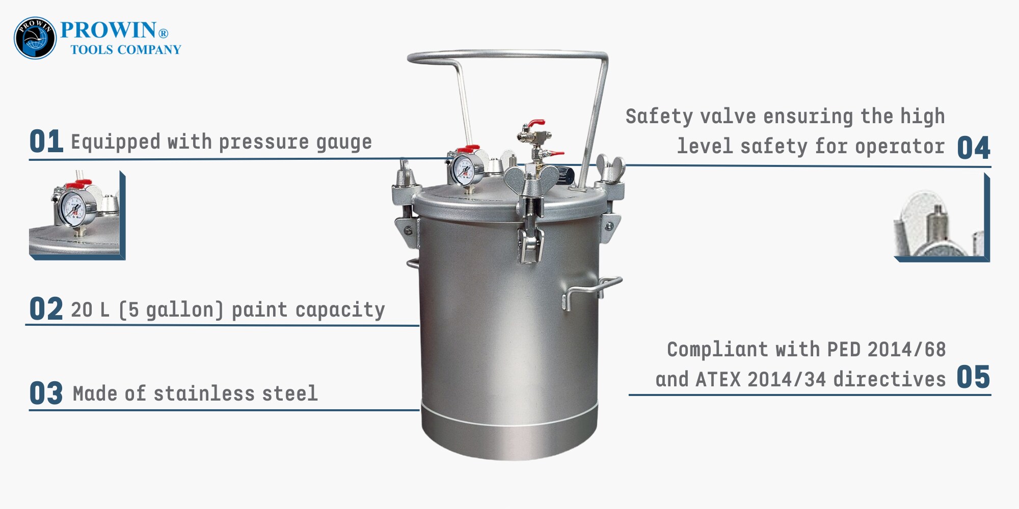 Prowin的PTS-20H不锈钢压力漆罐专为大面积喷涂而设计,如内外墙、机械、车库、模型或围栏等。不锈钢压力罐具有高耐腐蚀性和广泛的应用范围。容量为 20 升(5 加仑)的重型油漆压力罐非常适合各种涂料。包括压力表、空气调节器和安全阀,确保操作员的高水平安全。
