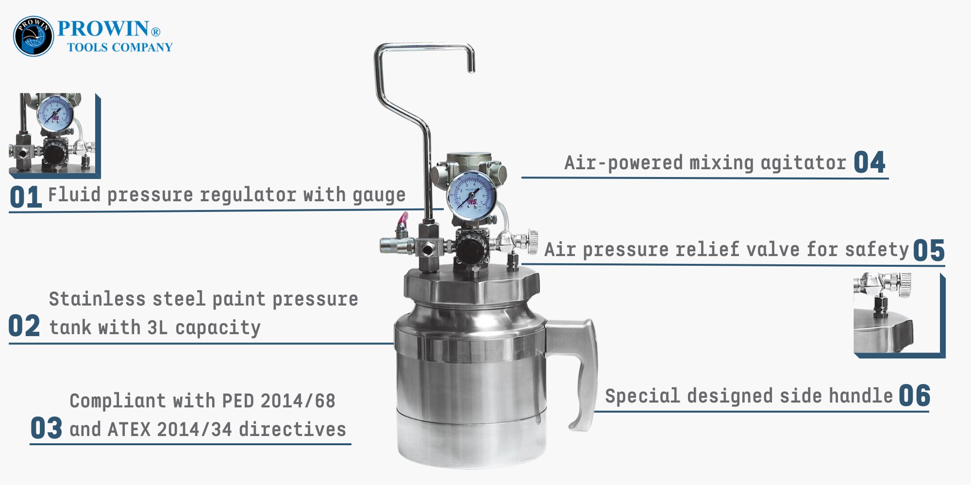 隆重推出 PTS-03AB 3L 不锈钢压力油漆罐 - 存储和快速涂抹大量油漆的理想解决方案。凭借其高压能力和大容量,这款压力罐非常适合商业涂装项目或任何需要大量喷涂的任务。 PTS-03AB 具有空气调节器、压力表、安全阀和专门设计的手柄,可提供精确的控制和更高的安全性。立即购买 PTS-03AB,让您的绘画游戏更上一层楼!