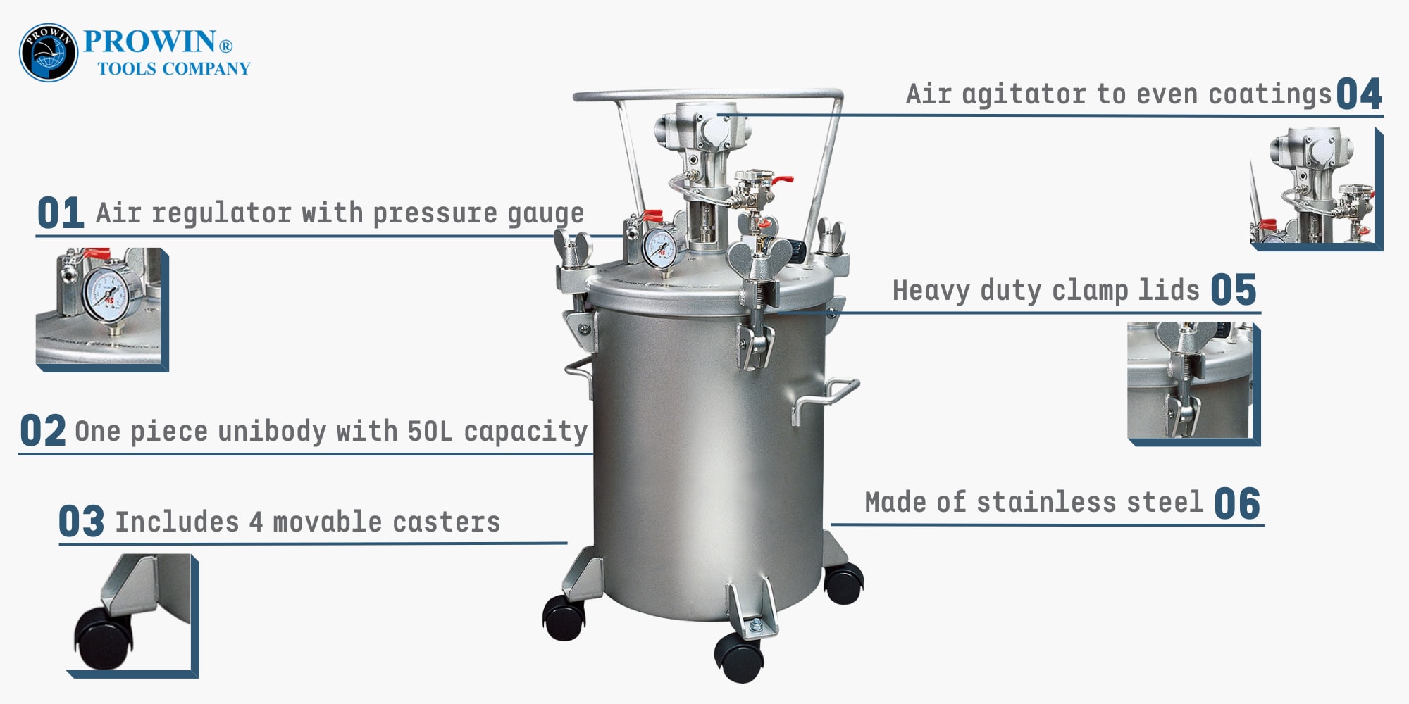 Prowin PTS-50A 喷漆压力锅由不锈钢制成,具有高耐腐蚀性和长使用寿命。漆罐配有自动泄压阀和重型盖夹,密封性能好,安全性高。喷漆压力罐配备强力空气搅拌器,避免涂层不均匀。容量为 50 升的油漆罐可存储大量油漆,因此涂抹速度更快,因此无需每隔一段时间重新填充。
