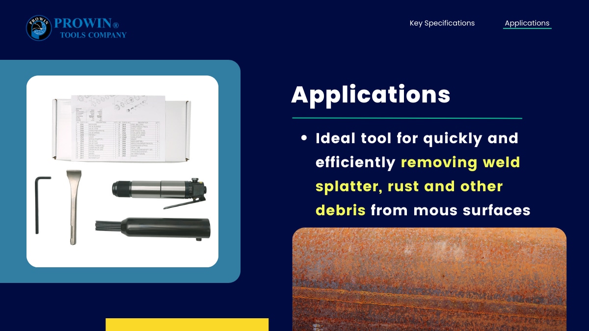 带有内部弹簧组件的卓越设计提供了更大的耐用性。适用于表面处理、除锈和脱漆。清洁和应力消除焊缝和接头。从针式洁牙机轻松转换为凿式洁牙机。