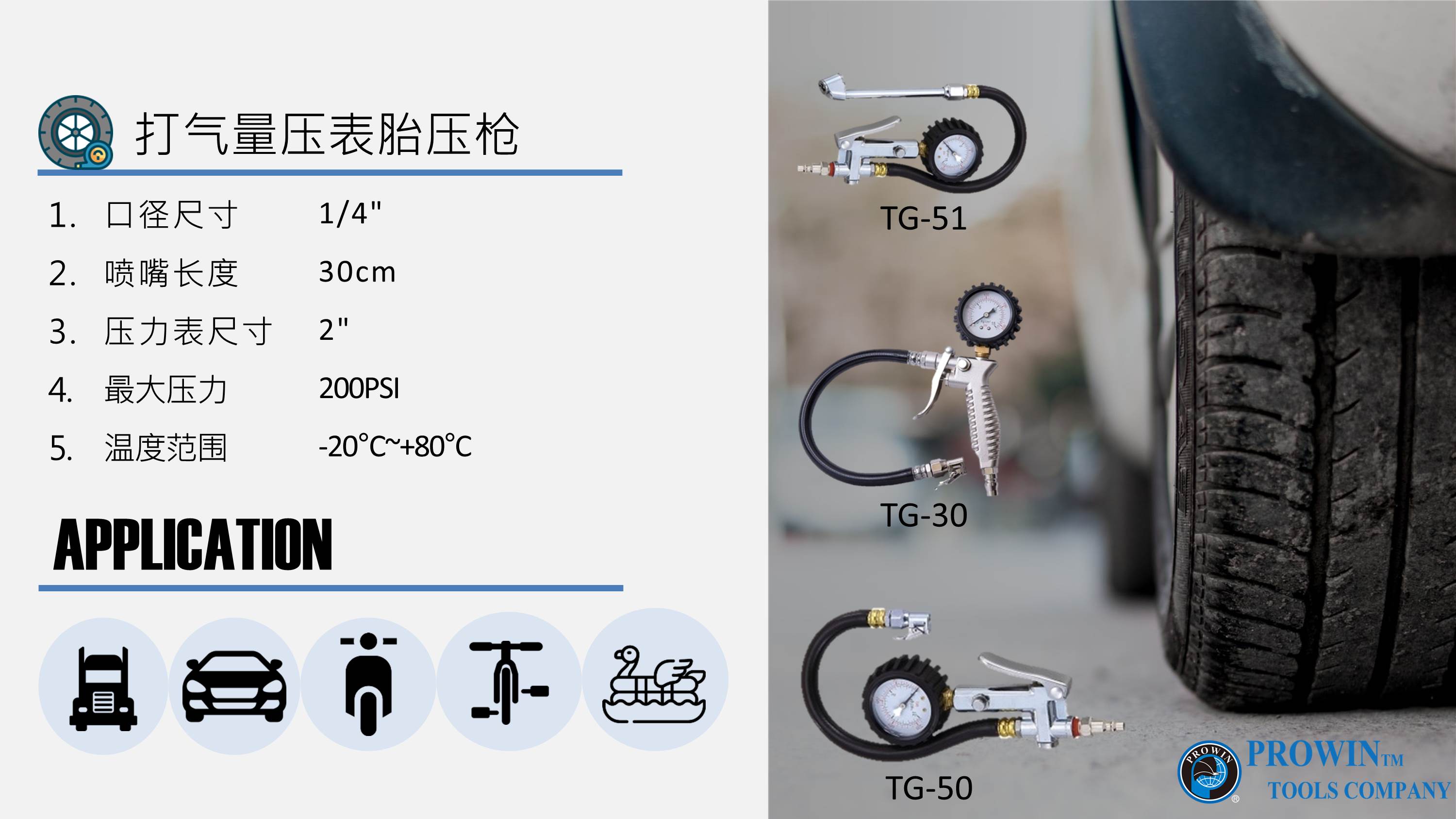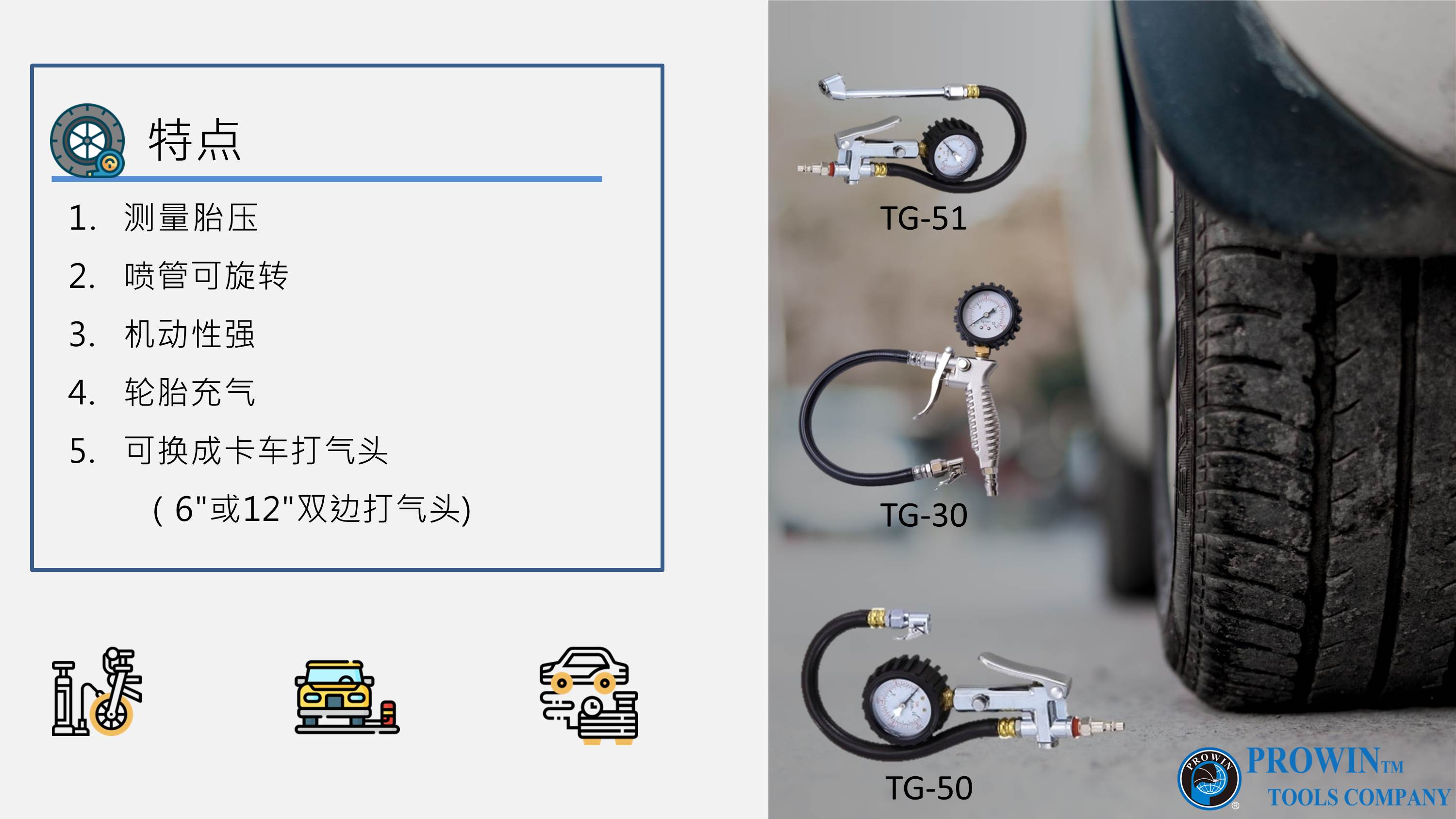 (2) 台湾制造的专业工业气动工具,可用于汽车、摩托车、自行车、卡车和充气玩具。
