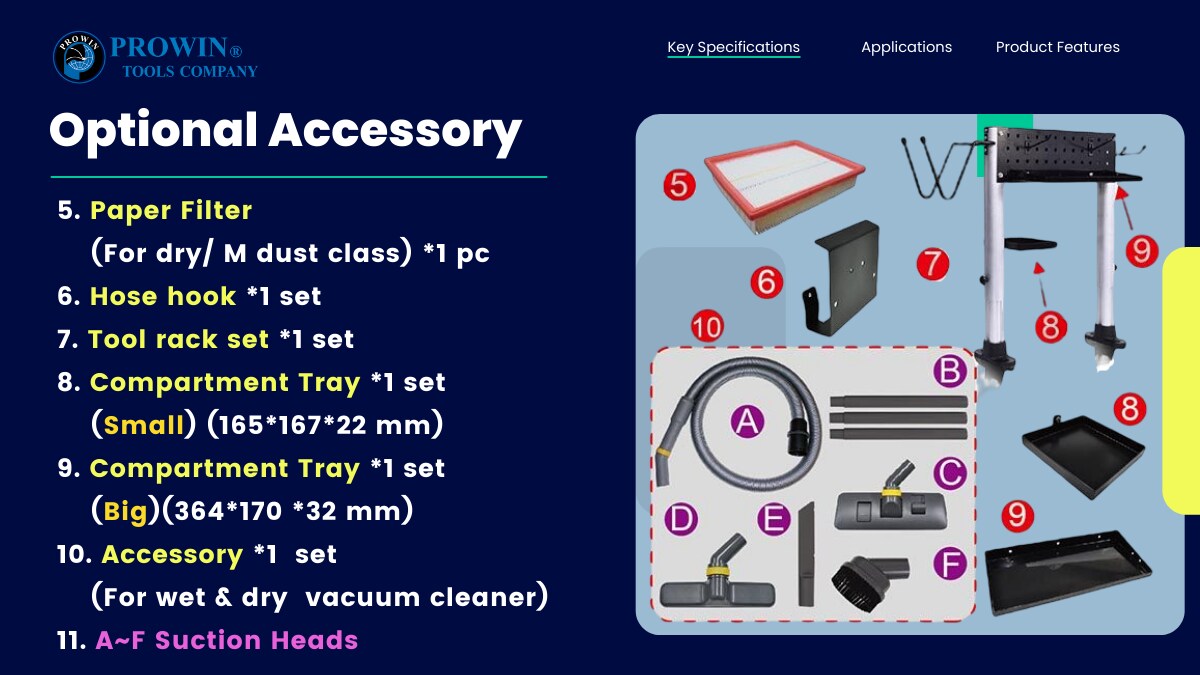 10) 可将托盘和工具组与吸尘器功能结合,工具组高度可调。包括单钩、多功能钩和工具钩都可以放置砂纸。让用户拥有完善的存储功能和工具辅助,操作更方便。 (选项)
