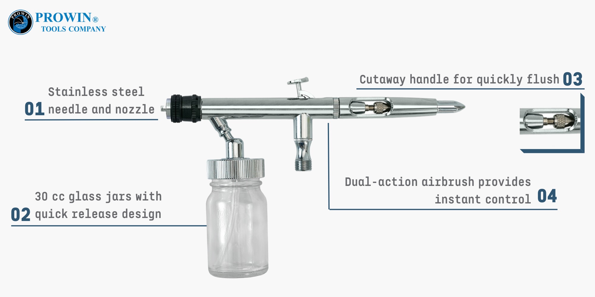 SG-810CF 扇形双作用喷枪提供即时控制,让您一次从宽幅喷雾变成细线。喷枪的不锈钢针头和喷嘴提供绝对的精度、对精细细节的全面控制以及较长的使用寿命。喷枪套装包括一把高品质喷枪、一把扳手、一个 ⅛ 英寸软管适配器和两个 30 毫升玻璃罐。