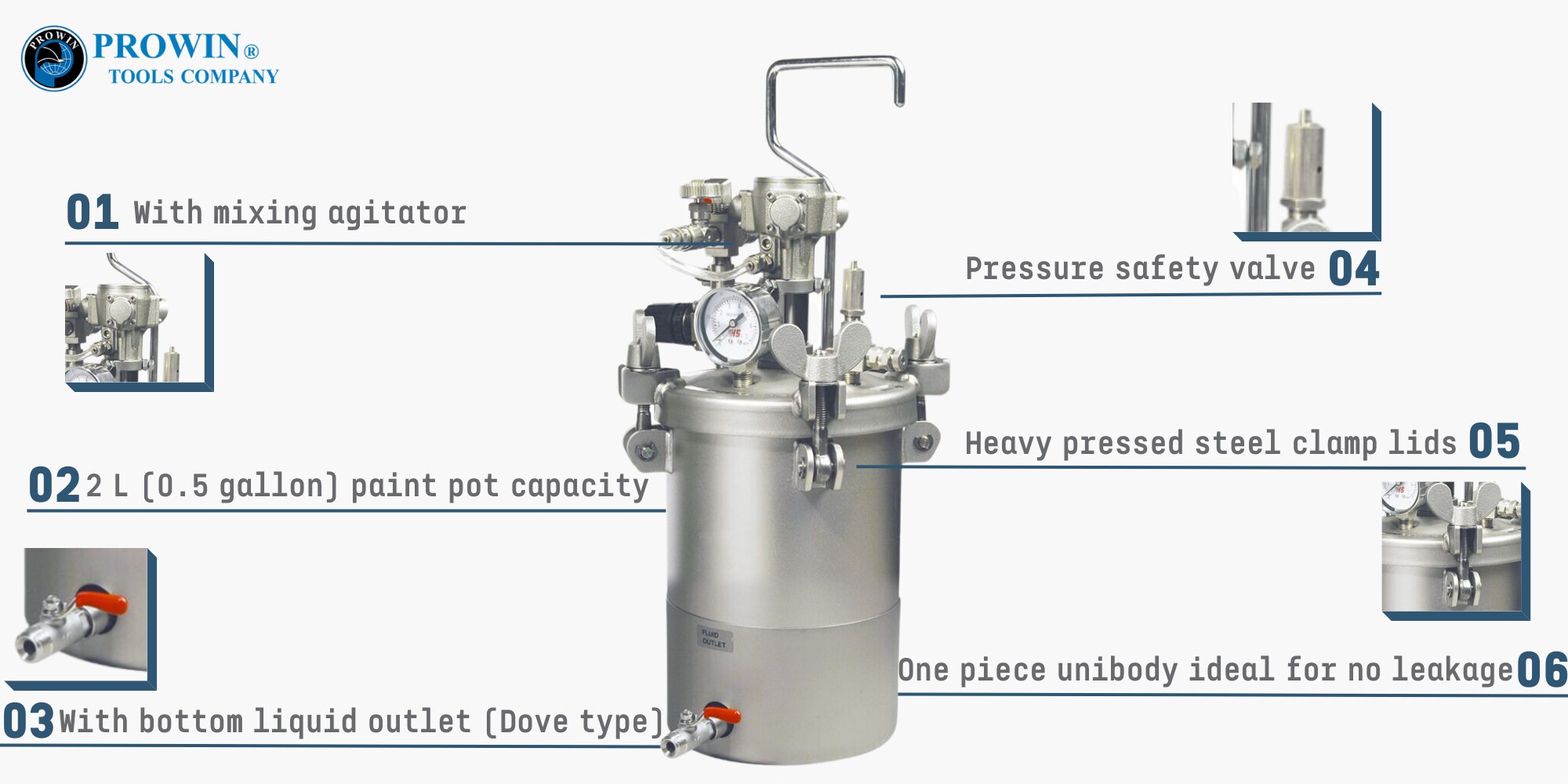隆重推出 Prowin PTS-02AD 鸽型不锈钢压力漆罐,带空气搅拌器,非常适合商业涂装或需要大量喷涂的场合。其 0.5 加仑 (2L) 的容量允许存储大量可以快速应用的油漆,从而节省时间和金钱。强大的空气搅拌器确保涂层均匀,而自动减压阀和重型盖子夹具提供出色的密封性能和高水平的安全性。使用这款顶级喷漆压力罐获得卓越的效果。