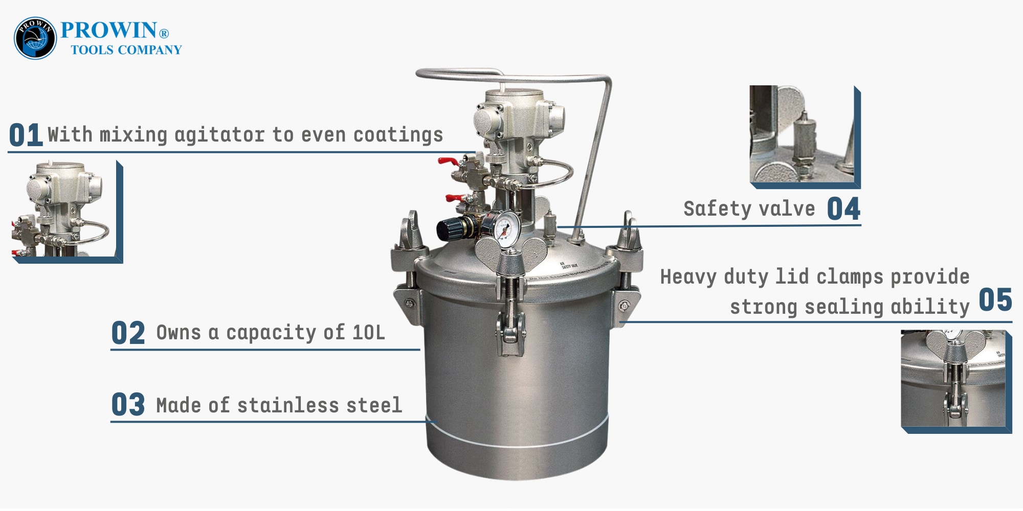 Prowin PTS-10AH 喷漆压力桶,容量为10L,由不锈钢制成,具有高耐腐蚀性和长使用寿命。漆罐配有自动泄压阀和重型盖夹,密封性能好,安全等级高。喷漆压力罐采用气动马达自搅拌,使桶内涂料保持均匀。在喷涂操作中,不会因涂料沉淀而出现色差。