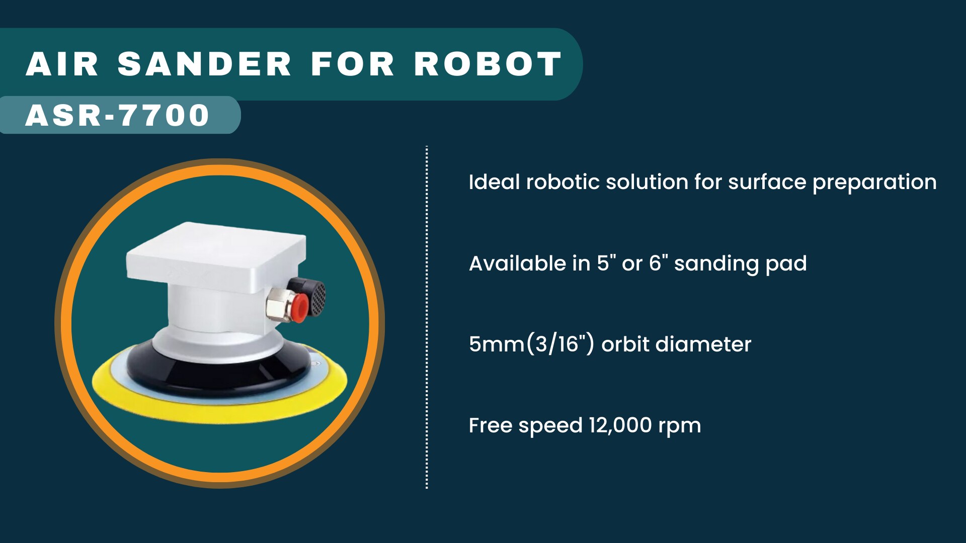 ASR-7700 5" 或 6" Air Orbital Sander 适合安装在机械臂上,提供强大的 12,000 RPM 电机和 3/16 英寸(5 毫米)轨道,提供无涡流表面处理。