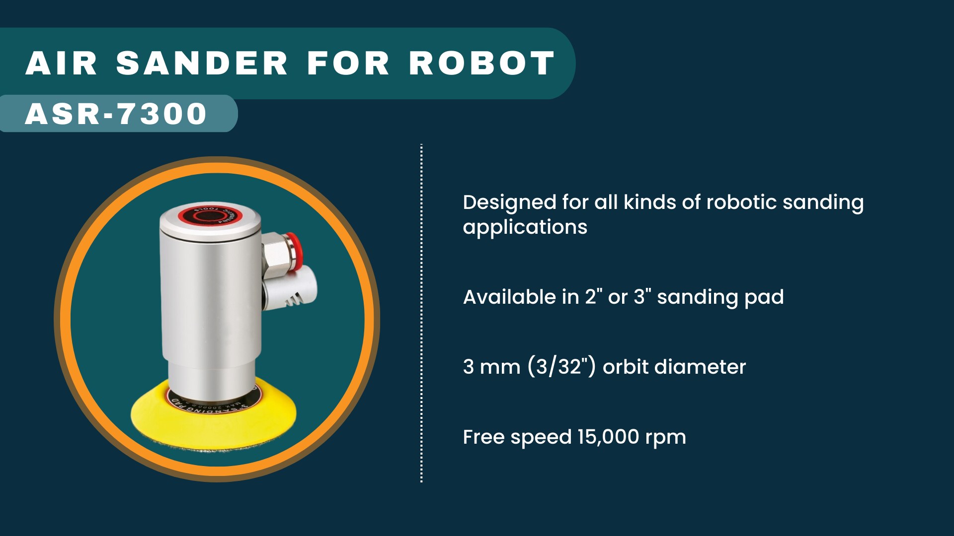 ASR-7300 是一款机器人气动打磨机,用于大规模生产中的表面精加工,专为与机器人手臂连续使用而设计。这种气动轨道打磨机设计紧凑、重量轻,可以轻松集成到大多数机器人手臂中。电机转速高达 15,000 RPM,非常适合精密打磨。 2" 或 3" 迷你打磨垫非常适合打磨难以触及的区域。