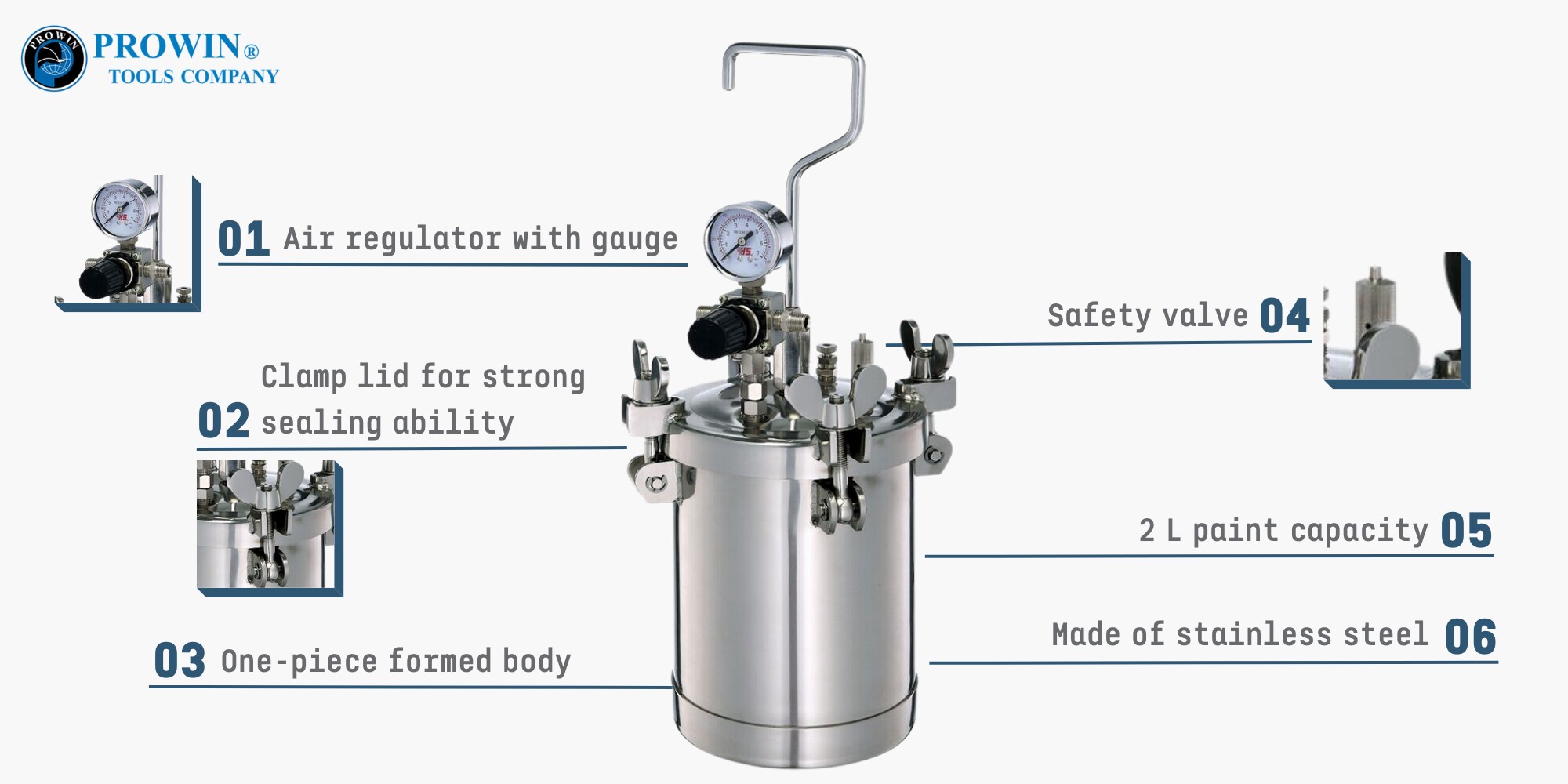 这款 PT-2ESS 压力涂料罐是顶级产品,拥有 2L 涂料容量和镜面抛光不锈钢表面。它采用一体式成型主体、重型压制钢盖和特别锻造的钢夹以增加耐用性。该罐具有自动泄压安全阀、空气调节器和压力表,可实现高水平的安全性和精确控制。它还通过了 CE 认证,确保符合安全标准。总的来说,这款压力涂料罐是任何喷漆项目的优质可靠选择。