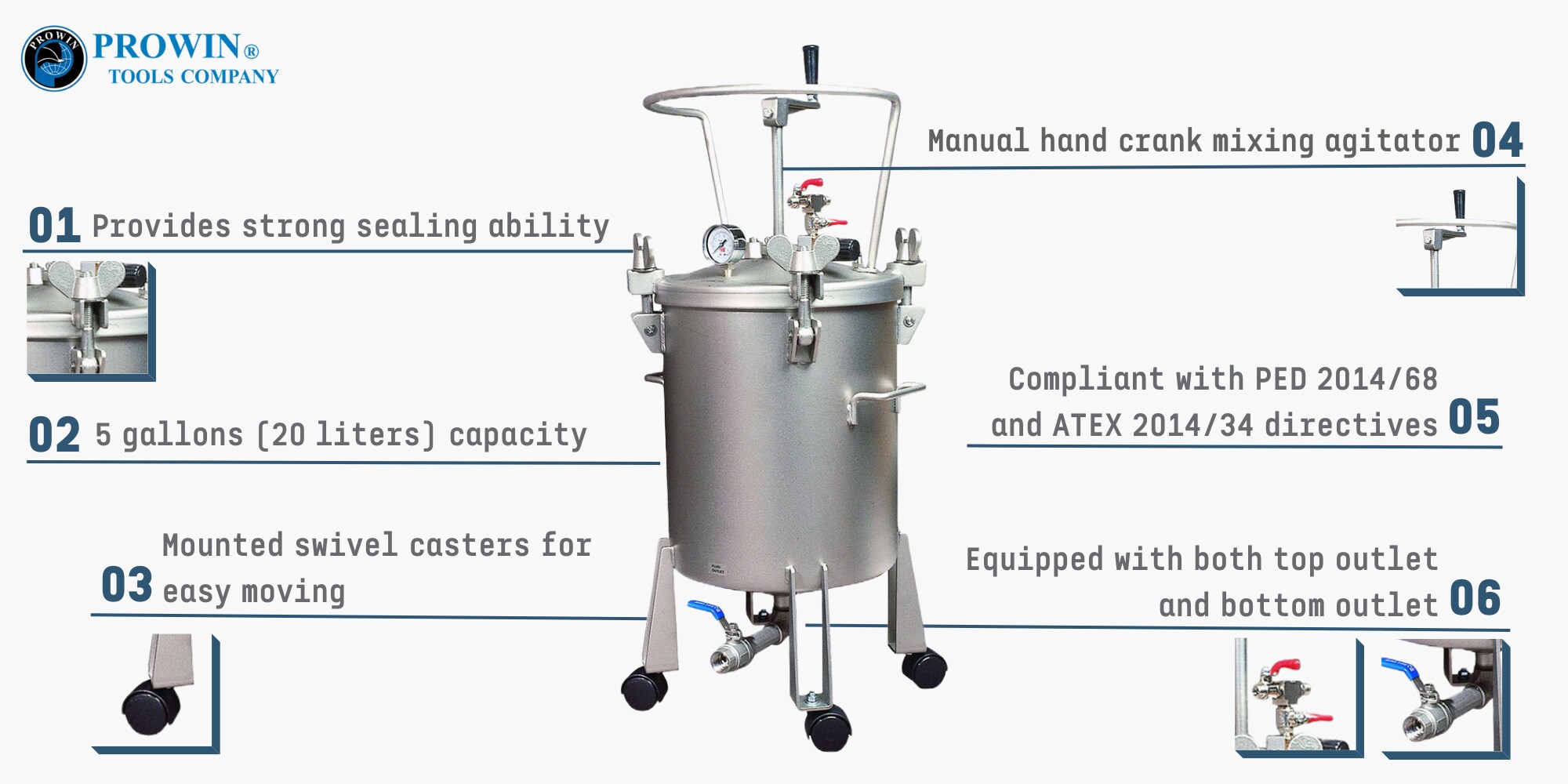 Prowin 的 PTS-20MD 一体式 20L 压力锅罐由不锈钢制成,具有高耐腐蚀性和耐用性。 PTS-20MD 旨在让您以一致的便携式压力完成大型喷涂作业。容量为 5 加仑(20 升)的重型涂料压力罐适用于工业涂料和大容量涂料。配备手动手摇混合搅拌器搅拌涂料,避免涂料沉淀不均。