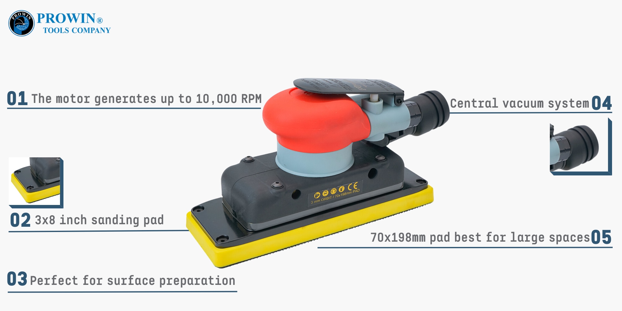这款 AS-605V 中央真空空气方形轨道打磨机配有 3x8 英寸(70x198 毫米)砂垫,非常适合表面处理。轨道打磨机具有 1/8"(3 毫米)随机轨道作用,可打造光滑精细的表面处理结果。打磨机可产生高达 10,000 RPM 的转速,并具有用于正向速度控制的内置调节器。中央真空系统可以快速去除锈迹。自真空 (AS-605D) 和非真空 (AS-605) 系统砂光机采用新型消音系统,可降低噪音水平,重量轻,体积小,符合人体工程学的握把设计易于操作。