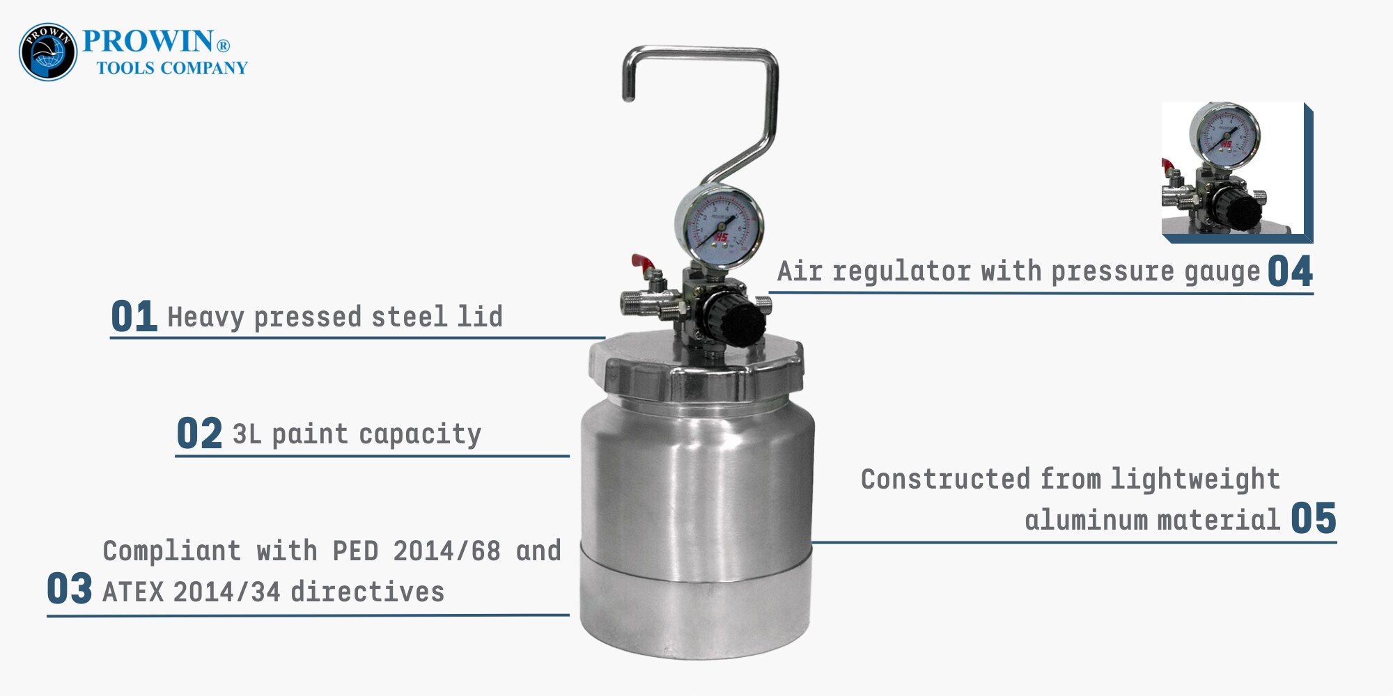 Prowin 多功能 PT-03H 铝制压力涂料罐专为提高效率和可靠性而打造。空气颜料罐具有 3 升的宽敞油漆容量,为各种绘画项目提供了充足的空间。它由轻巧耐用的铝制成,确保便携性而不影响强度。重压钢盖确保安全防漏密封。安全是最重要的,内置的安全阀可确保对操作员的保护。配备空气调节器和压力表,可以毫不费力地精确控制油漆应用。这款通过 CE 认证的铝制油漆罐 PT-03H 是汽车修补、DIY 项目和小型工业喷漆应用的理想选择。