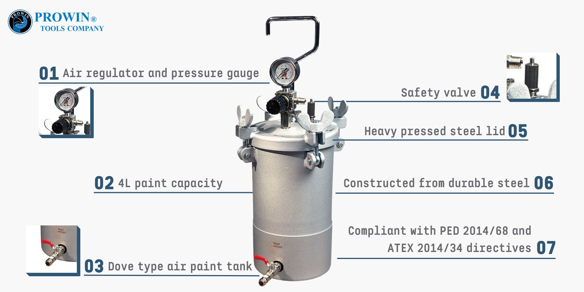 了解专为满足您的喷漆需求而设计的 PT-04HD 钢制气动压力涂料罐。凭借 4 升的宽敞涂料容量,涂料罐可确保高效且一致的应用。这款储气罐由坚固的钢制成,可确保耐用性和使用寿命。重压钢盖牢固地密封水箱,防止任何泄漏。喷漆罐配备安全阀、空气调节器和压力表,可对喷漆过程进行精确控制。该喷漆罐符合 PED 2014/68 和 ATEX 2014/34 指令,符合严格的安全标准。此外,其鸽型喷漆罐设计为您的喷漆项目增添了多功能性。