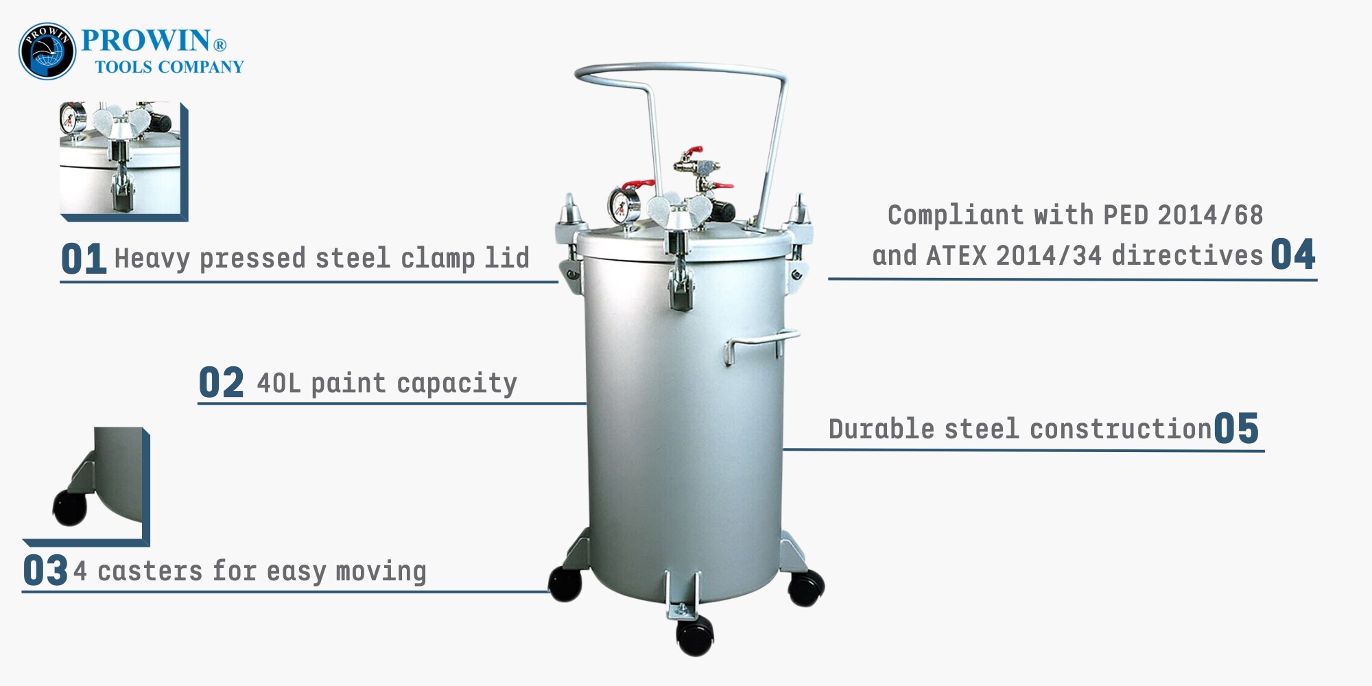 隆重推出我们的专业级钢制油漆罐 PT-40E,它采用坚固的一体式一体成型结构,具有持久的可靠性。气压涂料罐具有 40 升的涂料容量,可为广泛的项目提供充足的空间。由优质钢制成,确保耐用性。配备安全阀和重压钢夹盖,确保操作安全。包括 4 个脚轮,便于操作。符合严格的安全标准,包括 PED 2014/68 和 ATEX 2014/34 指令。使用我们卓越的钢制油漆罐 PT-40E 提升您的绘画体验。