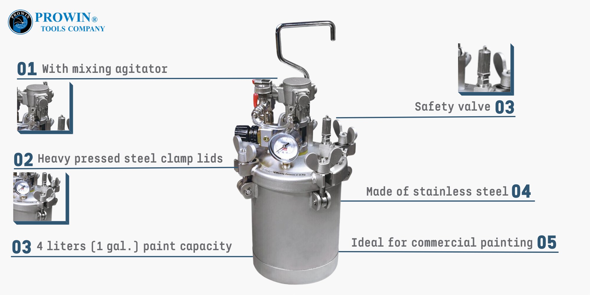 Prowin PTS-04A 4L 压力涂料罐是一款可靠耐用的工具,可提高商业喷漆项目的效率。由优质不锈钢制成,可轻松处理非磨蚀性和非腐蚀性材料。压力罐容量为 1 加仑(4 升),配备压力表、流体压力调节器、重型夹盖和泄压安全阀,确保设置准确和安全性高。此外,带有气动混合搅拌器的夹紧盖可确保涂层均匀。对于任何寻求提高生产力和安全性的专业油漆工来说,该工具都是一笔宝贵的财富。