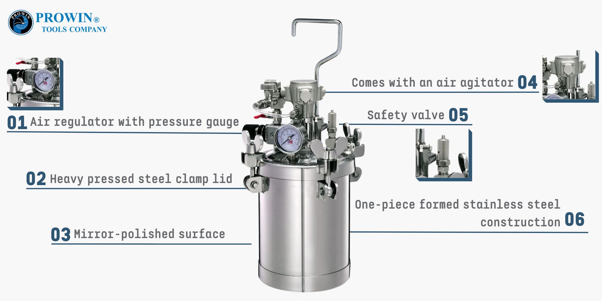 Prowin PT-5ASS 高性能压力油漆罐,旨在提升您的绘画体验。 凭借其宽敞的 4 升油漆容量,它可以毫不费力地处理大型项目。 内置的空气搅拌器可确保高效的涂料混合,从而确保平滑一致的结果。 配备空气调节器和压力表,您可以精确控制油漆应用。 镜面抛光表面便于清洁,一体式不锈钢结构确保耐用性。 此外,自动泄压安全阀确保始终安全运行。 使用我们可靠的压力涂料罐升级您的绘画游戏。