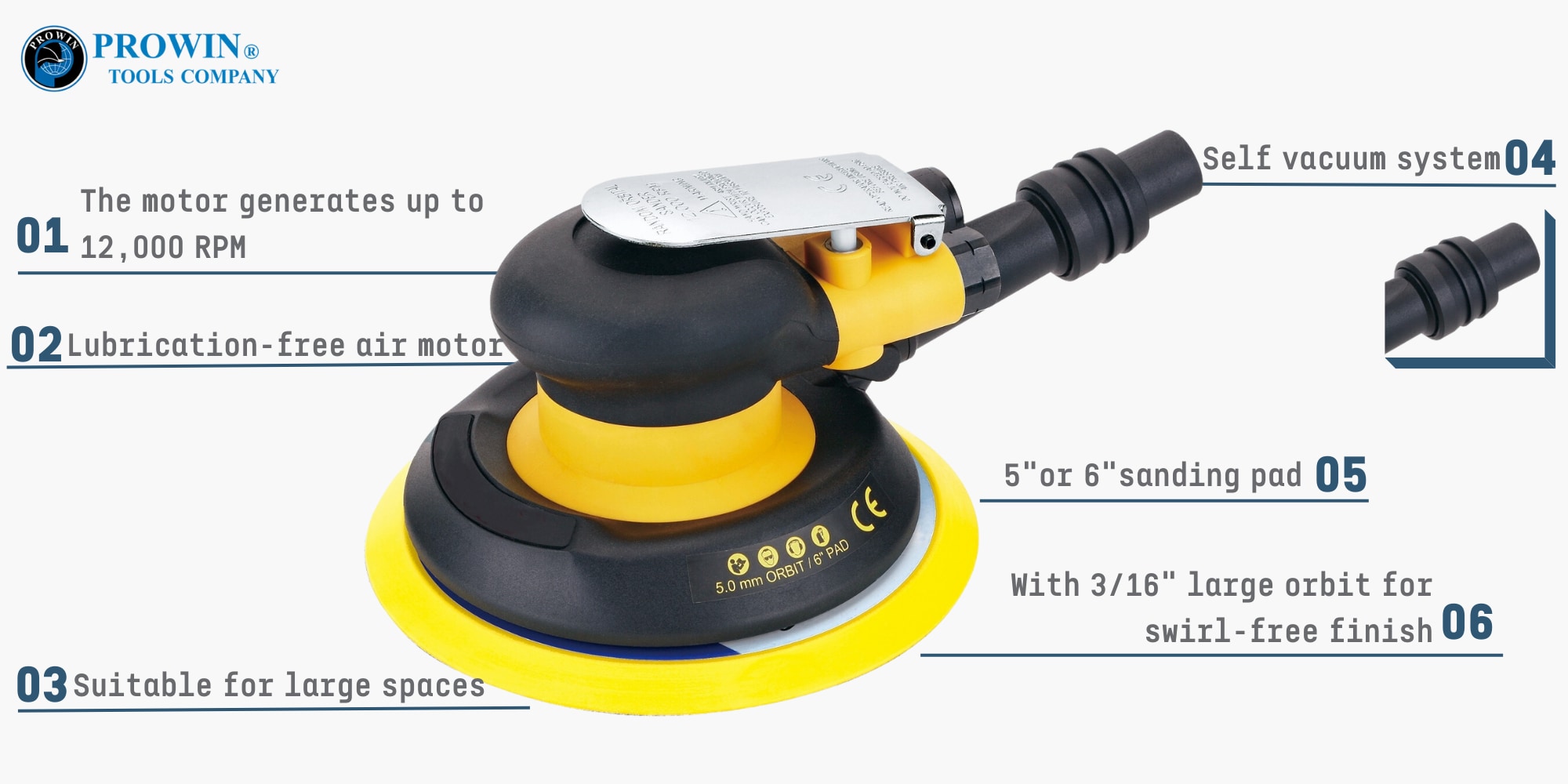 AS-F360D无油手掌砂光机适用范围广,适用于铁、木材、塑料、金属、橡胶、石材、大理石等材料的打磨、精细抛光。 5" 或 6" 气动砂光机可提供高达 12,000 rpm 的 3/16" 轨道,实现无涡流抛光。符合人体工程学的设计可提高舒适度和便利程度。气动气动砂光机配有免润滑气动马达,可提供无油使用,自生真空系统提供无尘环境,有非真空(AS-F360)和中央真空(AS-F360V)两种选择。