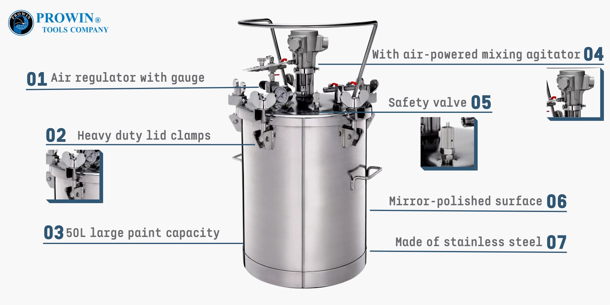 隆重推出我们功能强大的 PT-50AHSS 50L 压力涂料罐,专为各种应用而打造。凭借 50 升的宽敞涂料容量和气动混合搅拌器,它可确保高效均匀的涂料。镜面抛光表面、一体式不锈钢结构、重型夹盖和带压力表的空气调节器确保了最佳性能。自动泄压安全阀增加了额外的保护层。 50L 油漆罐非常适合工业、商业和大型油漆项目。