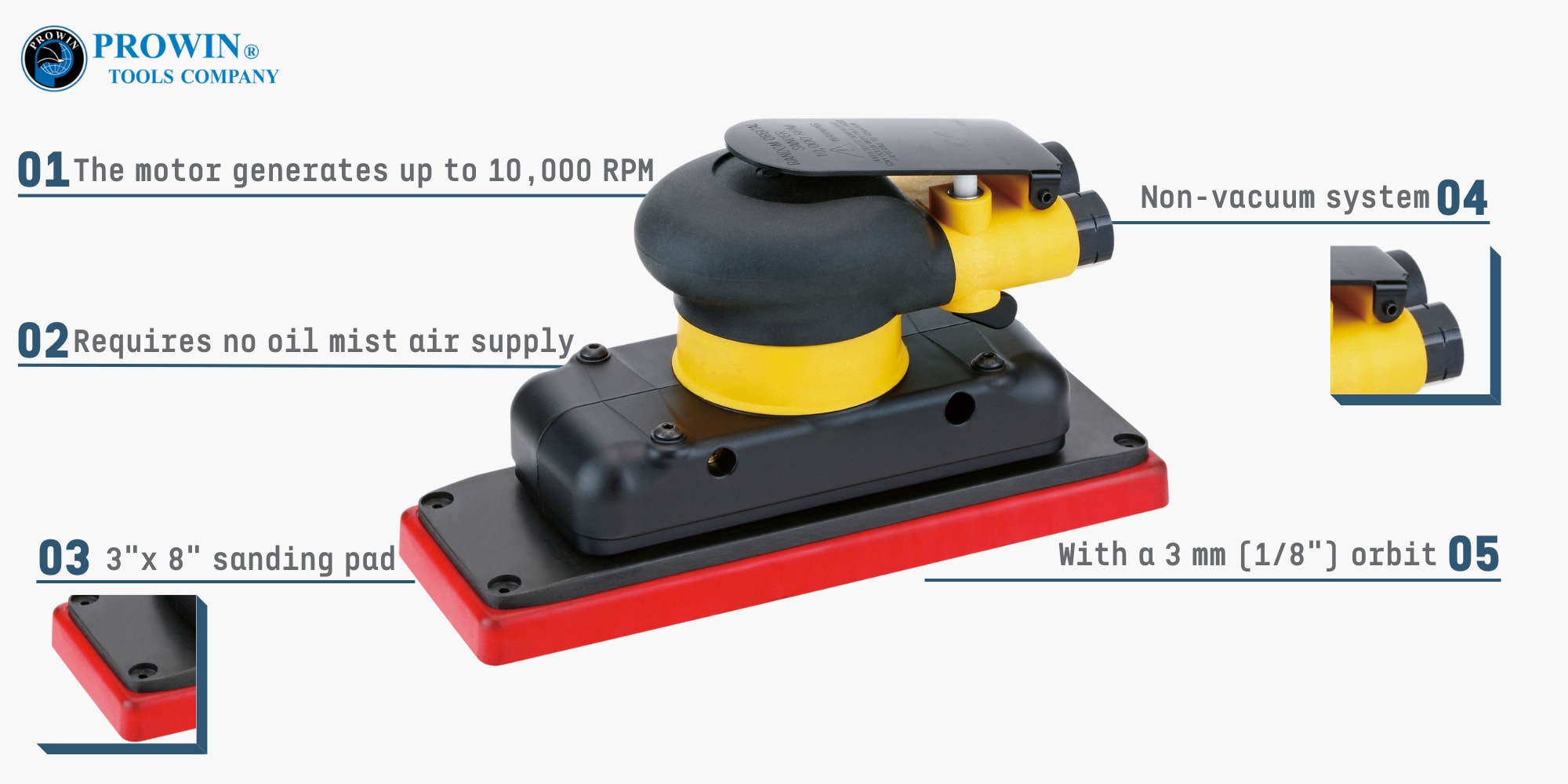 这款 AS-F605 3" x 8" (70 x 198 mm) 空气方形轨道打磨机非常适合表面处理。这款方形砂光机配备 10,000 RPM 电机和 3 mm (1/8") 轨道,始终具有无涡流表面。轻巧的设计和低振动水平 (2.5 m/s²) 提供顺畅的打磨体验。气动砂光机不需要油雾空气供应,减少了准备表面的污染。