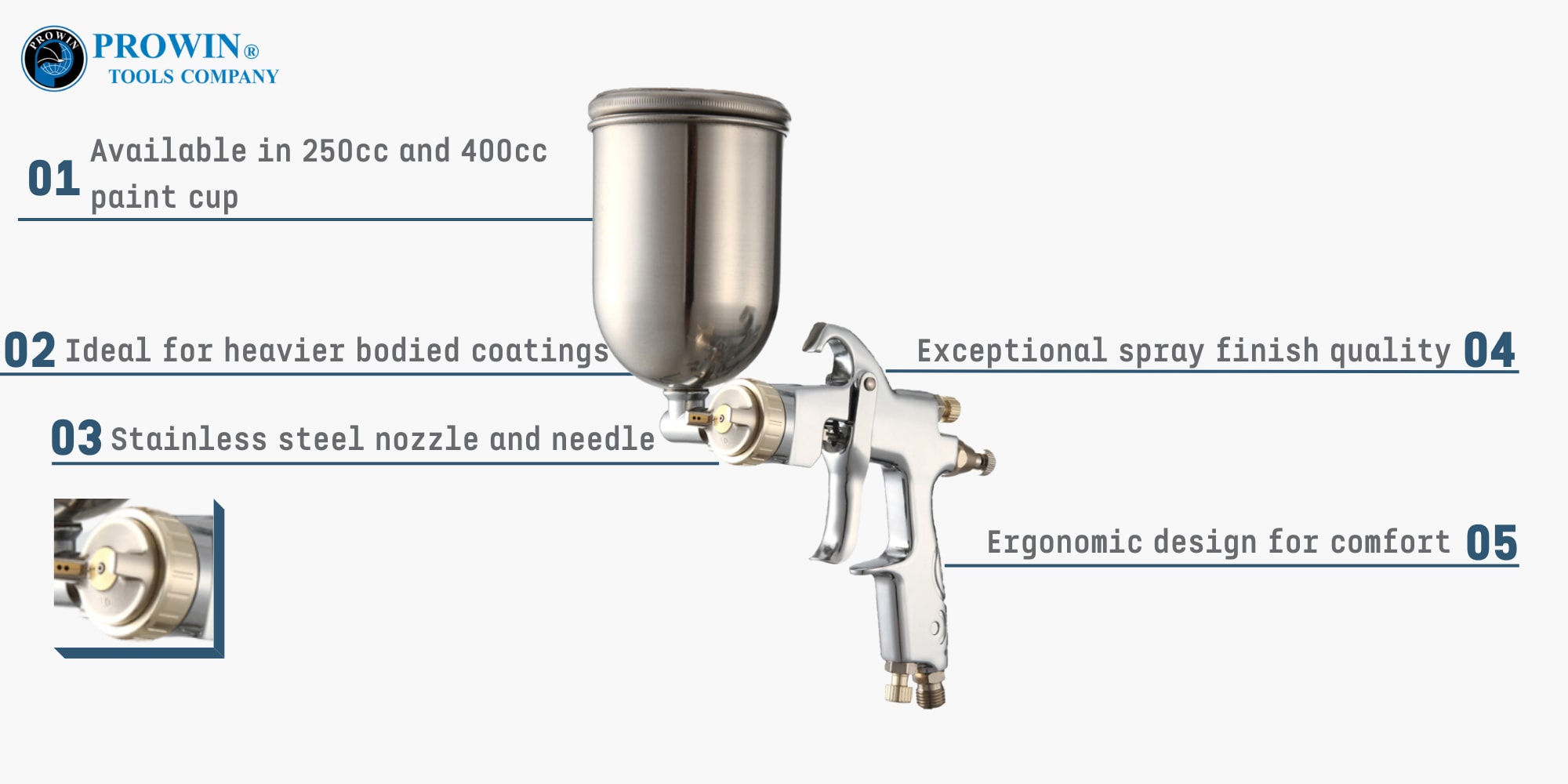 Prowin K-607G 高压喷枪在喷枪的针、喷嘴和气帽系统中采用了创新技术,因此在所有油漆涂层上都能达到完美的性能。油漆涂层以理想的扇形图案完全雾化,完美铺设,形成干净均匀的底漆或面漆。适用于各种不同的应用,例如汽车、工业、船舶和木工。
