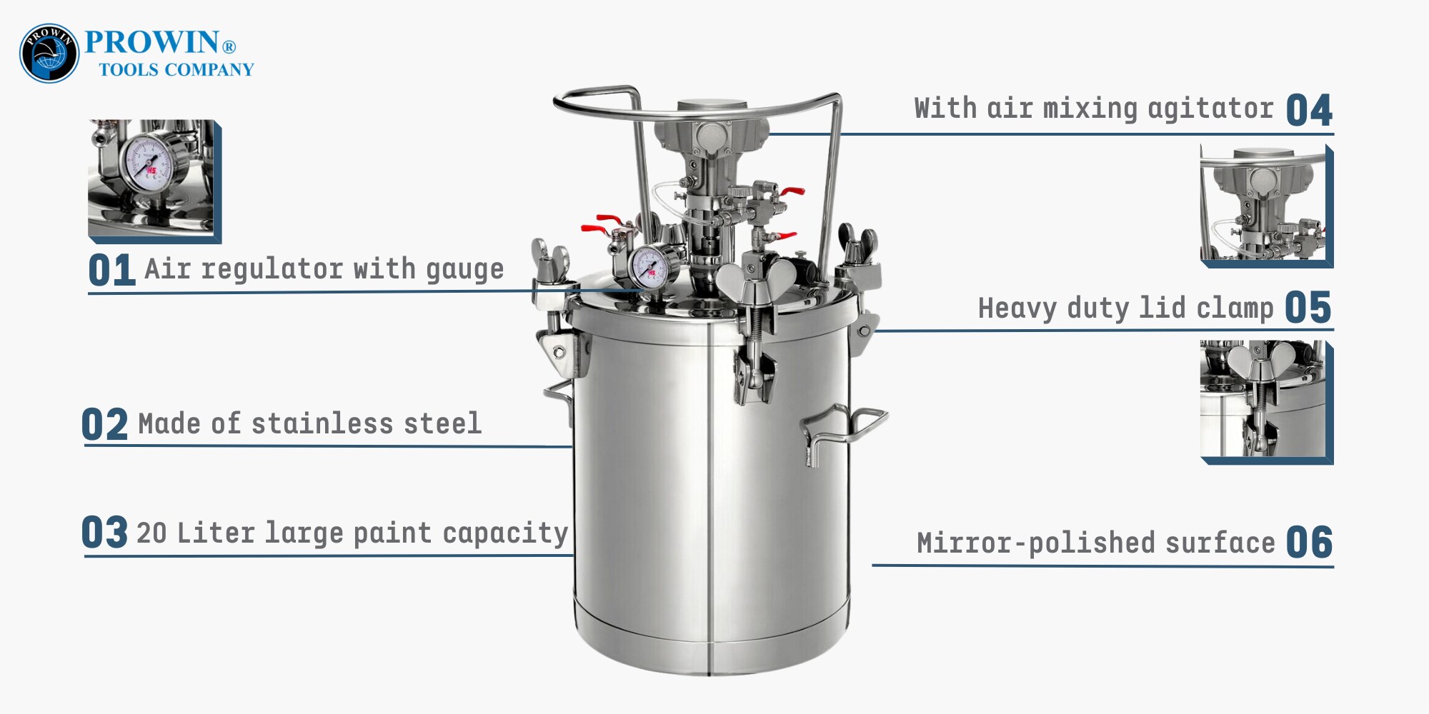 隆重推出我们的高性能 PT-20AHSS 气动油漆压力罐,专为满足专业油漆工的需求而设计。其 20 升大涂料容量可确保不间断的生产力。它由耐用的不锈钢制成,可确保持久的性能。空气混合搅拌器可防止涂层不均匀,而重型盖夹可提供牢固的密封。镜面抛光表面简化了清理工作,气压表和调节器可实现精确控制。符合 PED 2014/68 和 ATEX 2014/34 指令,它优先考虑安全性和合规性。使用 Prowin 卓越的油漆罐彻底改变您的绘画过程。